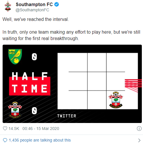 홈팀 사우스햄튼은 선공에 나서 틱택토 판을 SNS에 올렸지만 노리치의 공식 SNS는 45분 동안 반응이 없었다. 그러자 사우스햄튼은 전반전이 끝나고 하프타임에 돌입했다며 익살을 떨기도 했다.