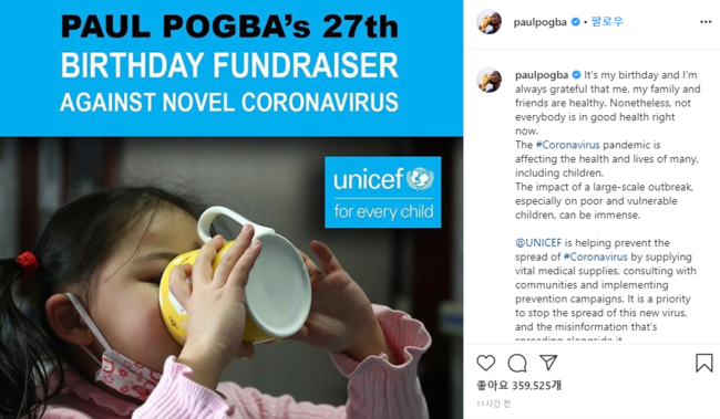 이제 포그바가 코로나를 위한 사회적 기금 마련을 위해 나섰다. 그는 자신의 27번째 생일에 맞춰 유니세프의 기금 마련을 홍보하며 코로나 확신을 하나로 뭉칠 것을 호소했다.