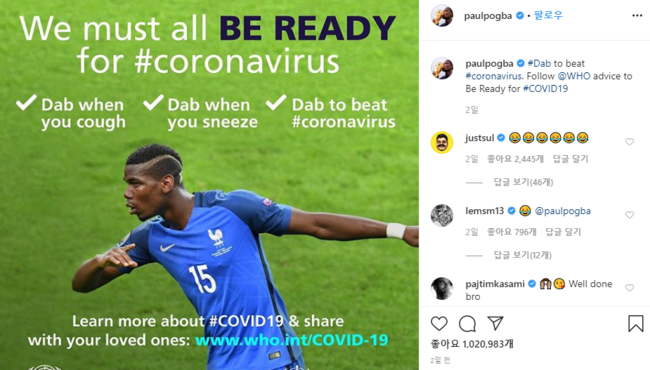 포그바는 앞서 자신의 댑 세리머니를 바탕으로 세계보건기구(WHO)의 권고에 따라 기침을 할 때 입을 가리라고 강부하기도 했다.