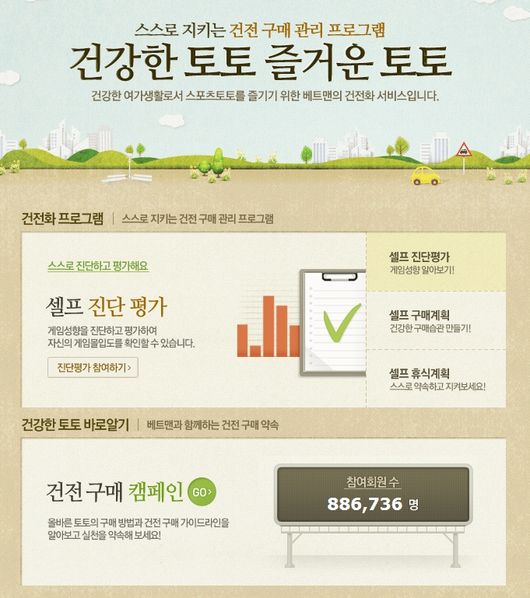 한편, 스포츠토토에서 진행하고 있는 건전화 프로그램에 대해 자세하게 알고 싶은 사람은, 베트맨을 방문해 ‘건강한 토토, 즐거운 토토’ 코너를 클릭하면 된다.