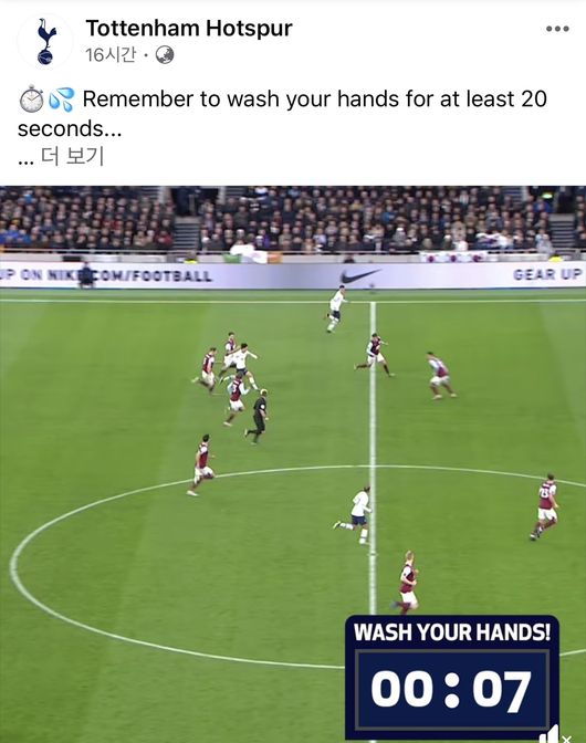 토트넘은 18일(한국시간) SNS를 통해 코로나19 감염 방지를 위한 손 씻기 컨텐츠를 올렸다. 국내에서는 30초가량 손을 씻으라는 조언이 있는 가운데 토트넘 구단은 20초로 규정했다. 그리고 손흥민의 돌파에 이은 골 장면을 이용하며 20초를 카운트 했다.