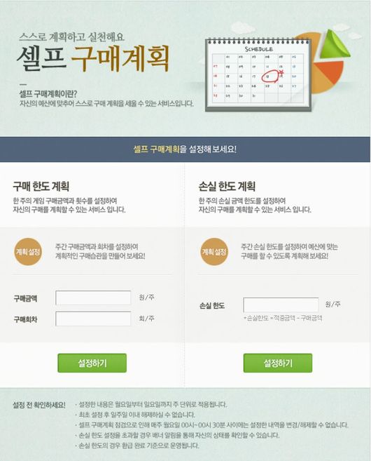 ‘셀프 구매계획’을 통해 설정한 내용은 월요일부터 일요일까지 주 단위로 적용되며, 최초 설정 후 일주일 이내에는 해제할 수 없다. 손실 한도 설정을 초과할 경우 배너 알림을 통해 자신의 상태를 확인할 수 있으며, 손실 한도는 환급 완료 기준으로 운영된다.