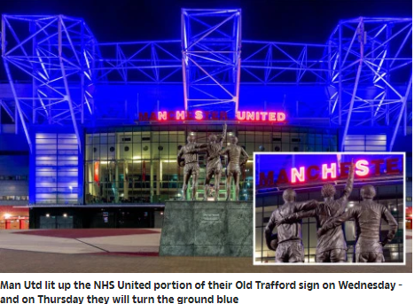 NHS를 위한 맨유의 응원은 여기서 끝이 아니다. 더 선은 "올드 트래포드는 NHS에 찬사를 보내기 위해 사상 처음으로 지역 라이벌 맨체스터 시티의 상징색인 파란색으로 바꿀 것이다'라고 전했다.