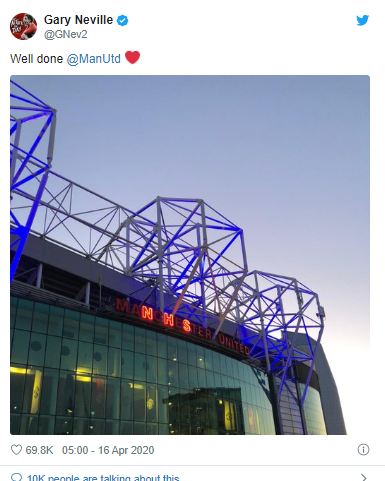 더 선은 "올드 트래포드는 이제 헌혈 센터로 개방될 수도 있다. 또한 맨유의 전설 개리 네빌 역시 자신의 호텔을 NHS 직원을 위해 무료로 제공할 것이다"라고 강조했다.