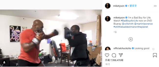 복귀를 위해 몸상태를 끌어 올리고 있는 타이슨은 지난 2일 자신의 SNS에 훈련 영상을 올렸다. 짧은 영상이지만 타이슨은 미트를 향해 여전한 스피드와 파괴력으로 주먹을 날렸다.