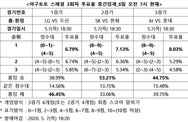 KBO 3경기 대상 야구토토 스페셜 6회차 투표율 중간집계