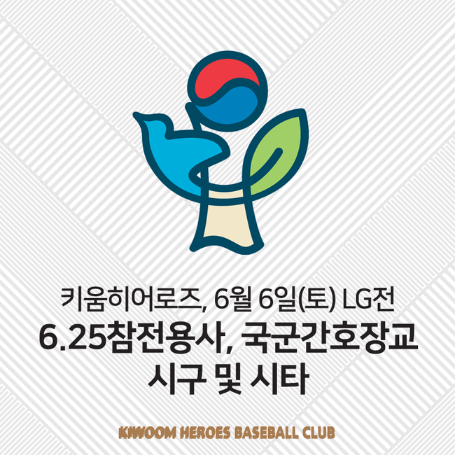 첫 번째 행사로 현충일인 6일(토) 오후 5시 서울 고척스카이돔에서 열리는 LG트윈스와의 경기에 6.25 참전용사 정기숙 옹과 국군수도병원 간호장교 이혜민 소위를 시구, 시타자로 초청한다.