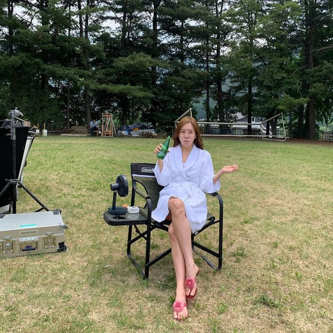 공개된 사진 속 김정은은 야외 촬영장으로 보이는 공간에서 음료를 들이키고 있다. 이때 김정은은 얇은 샤워 가운만 걸친 채 선풍기 바람을 쐬며 더위를 달래는 중. 이 순간조차 음료 광고처럼 느껴지게 하는 김정은의 미모가 눈에 띈다.