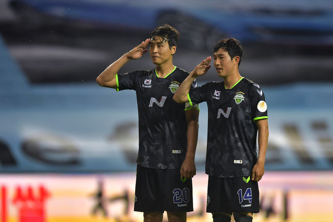 이날 결승골을 터트린 뒤 '거수경례'를 통해 세리머니 장인이 된 이동국은 "준비를 한 것도 있다. 6월은 호국보훈의 달이었다. 나라를 지킨 분들께 감사의 인사를 전하고 싶었다. 예비역 병장 이승기 선수가 함께 있어서 같이하게 됐다. 팬들께서 경기장에 오시지 못하기 때문에 집에서 시청하실 때 의미를 전달하고 싶었다"라고 대답했다.