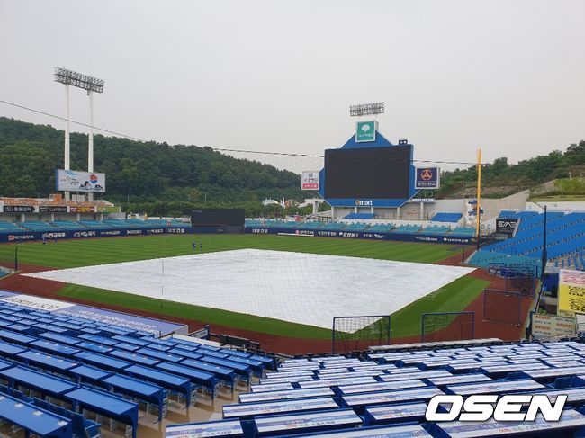 대구삼성라이온즈파크에 비가 내리고 있다. 방수포가 깔렸고 삼성-한화전이 우천 취소될 경우 오는 25일 더블헤더로 열린다.