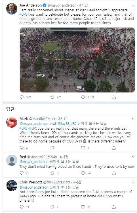 시내에 집결한 리버풀 팬들에게 앤더슨 시장은 "코로나는 여전히 우리에게 큰 위험이다. 이미 우리 도시는 너무 많은 사람을 코로나로 잃었다"라고 당부했다.