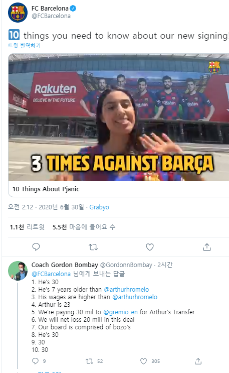 이 팬은 " 우리는 아르투르 영입에 이적료를 냈다. 우리는 이번 트레이드로 이적료 손해를 봤다. 우리 보드진은 멍청이다. 그는 30살이다. 30살! 30살이라고!!!"라고 조목조목 이번 영입을 비판했다.