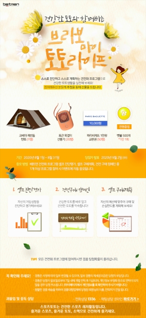 국민체육진흥공단이 발행하는 체육진흥투표권 스포츠토토 공식온라인 발매사이트 베트맨(www.betman.co.kr)이 2020년 8월 건전화 이벤트인 ‘건강한 토토와 함께하는 브라보 마이 토토라이프’를 실시한다.
