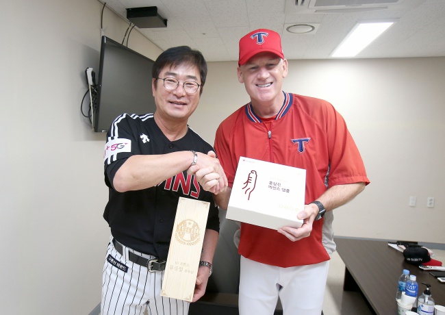맷 윌리엄스 KIA타이거즈 감독과 류중일 LG트윈스 감독이 5일 광주-기아 챔피언스필드에서 열리는 경기에 앞서 와인과 답례품을 교환했다. 윌리엄스 감독은 항상 준비했던 와인을 선물했다. 품목 선정을 놓고 엄청나게 고민을 했다는 류 감독은 한국의 건강 특산품인 홍삼엑기스를 준비했다.