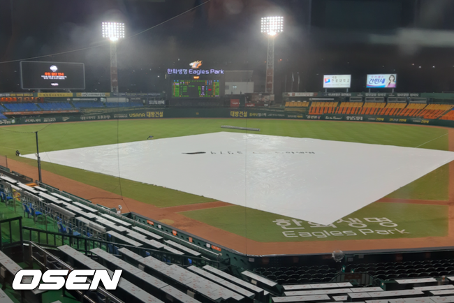 한화 선발 김민우도 2⅔이닝 무안타 2사구 2탈삼진 무실점으로 호투 중이었지만 갑작스런 비로 아쉬움을 삼켰다. /waw@osen.co.kr