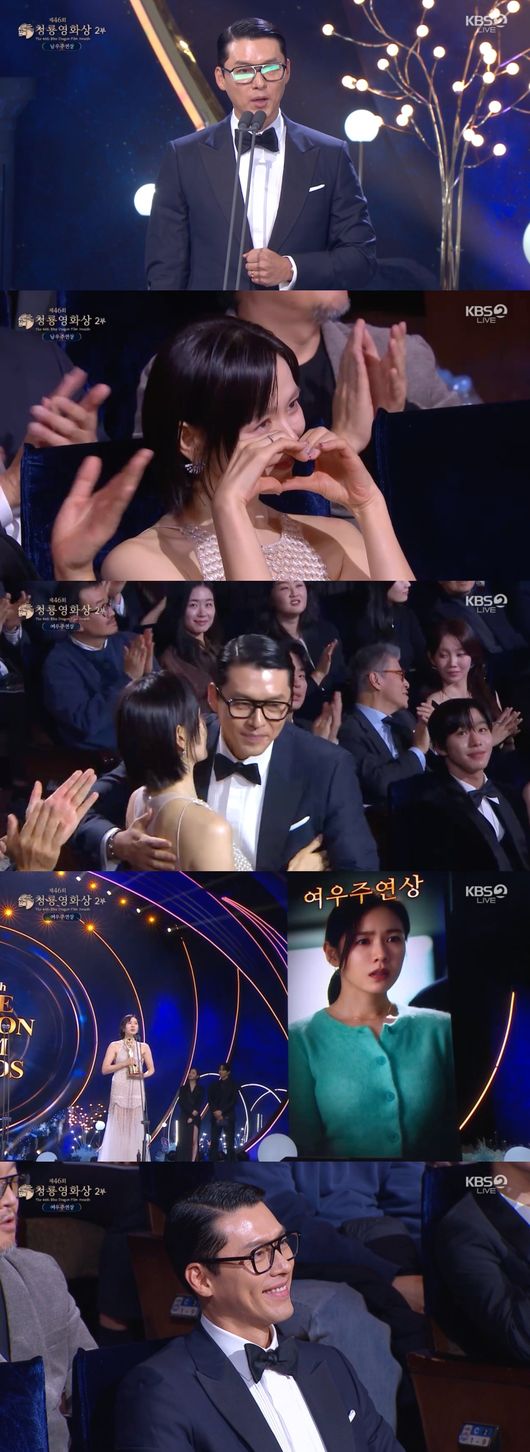 지난 19일 서울 여의도 KBS홀에서 열린 제46회 청룡영화상은 지난해에 이어 한지민·이제훈이 공동 MC를 맡아 진행됐다. 이날 현빈은 ‘하얼빈’ 팀, 손예진은 이성민·염혜란 등 ‘어쩔수가없다’ 팀과 나란히 착석해 투샷만으로도 현장을 뜨겁게 달궜다.