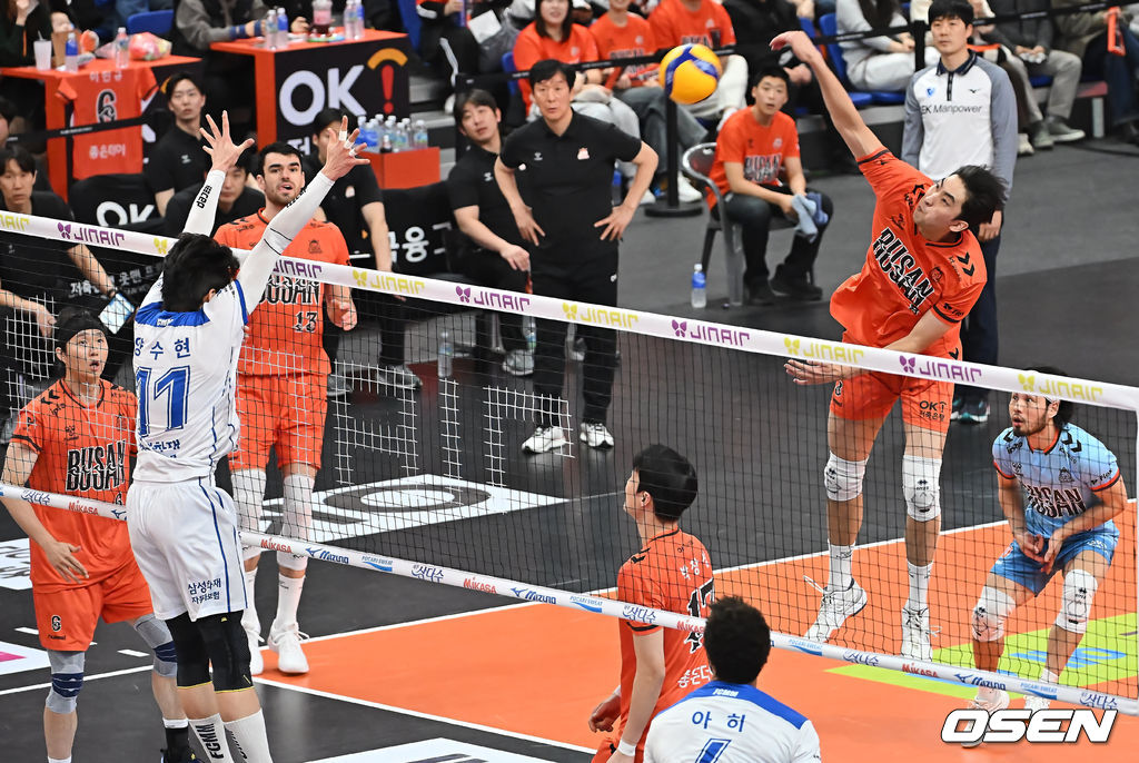 17일 부산 강서실내체육관에서 진에어 2025-2026 V리그 남자부 OK저축은행과 삼성화재의 경기가 열렸다.