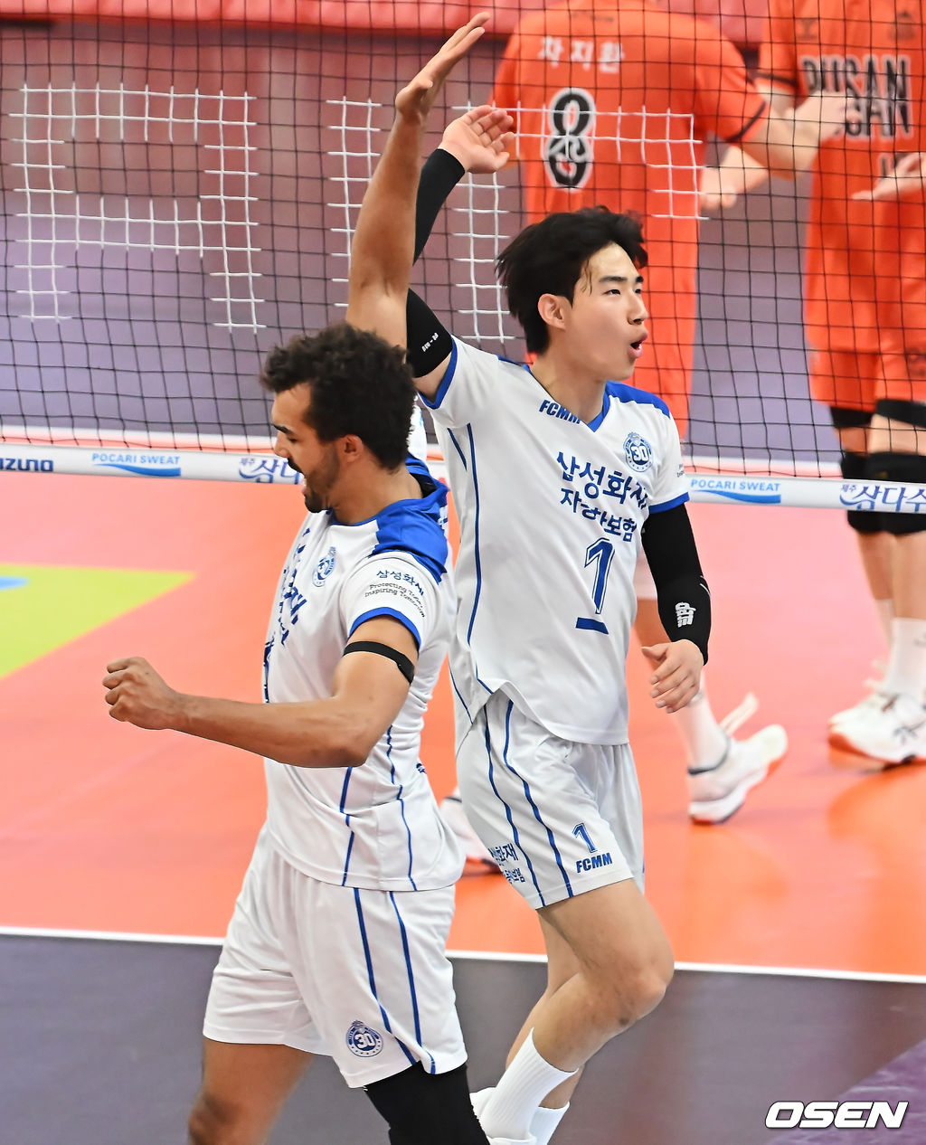 삼성화재 김우진이 득점에 성공한 후 아히와 기쁨을 나누고 있다. 2026.01.17 / foto0307@osen.co.kr