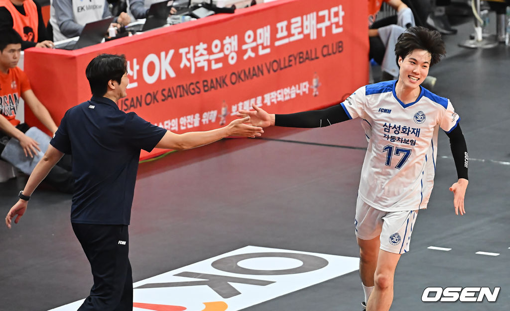 삼성화재 이윤수가 블로킹 득점을 올리고 고준용 감독 대행과 하이파이브를 하고 있다. 2026.01.17 / foto0307@osen.co.kr