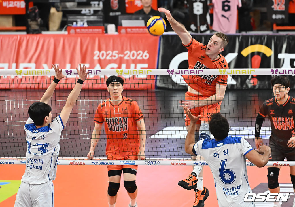 17일 부산 강서실내체육관에서 진에어 2025-2026 V리그 남자부 OK저축은행과 삼성화재의 경기가 열렸다.
