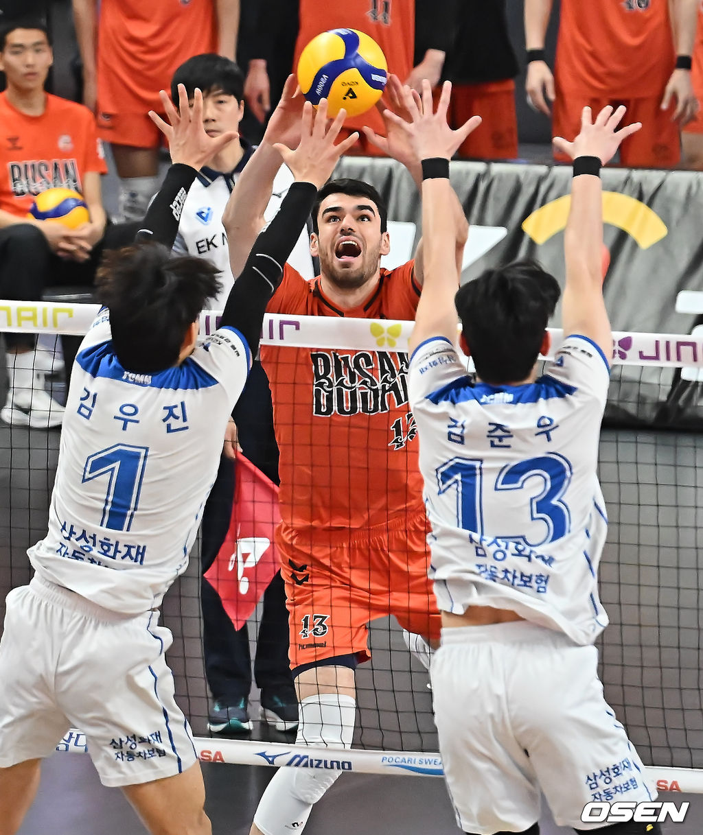 17일 부산 강서실내체육관에서 진에어 2025-2026 V리그 남자부 OK저축은행과 삼성화재의 경기가 열렸다.