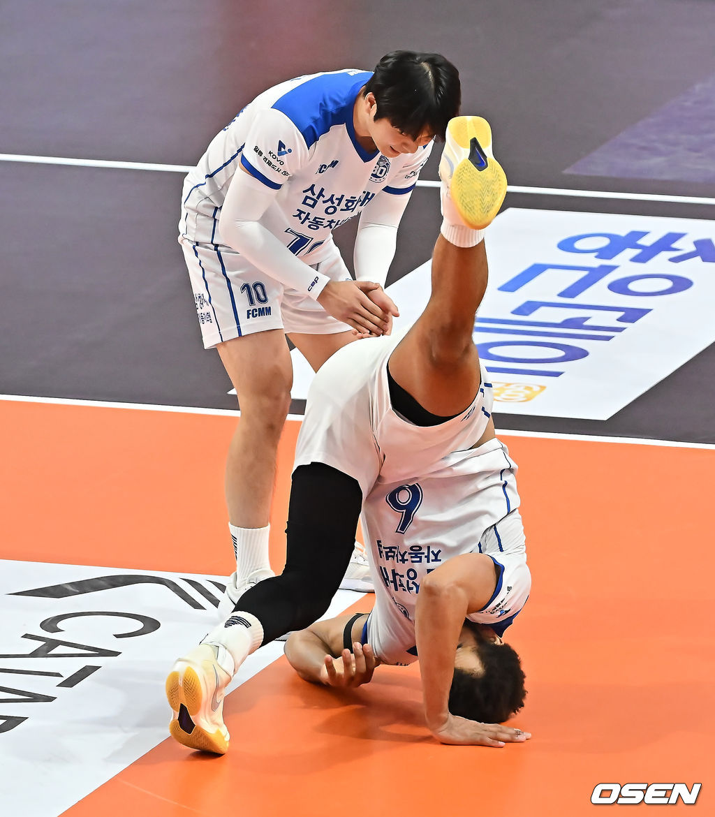삼성화재 아히가 블로킹 득점을 올리고 묘기 부리듯 넘어지고 있다. 2026.01.17 / foto0307@osen.co.kr