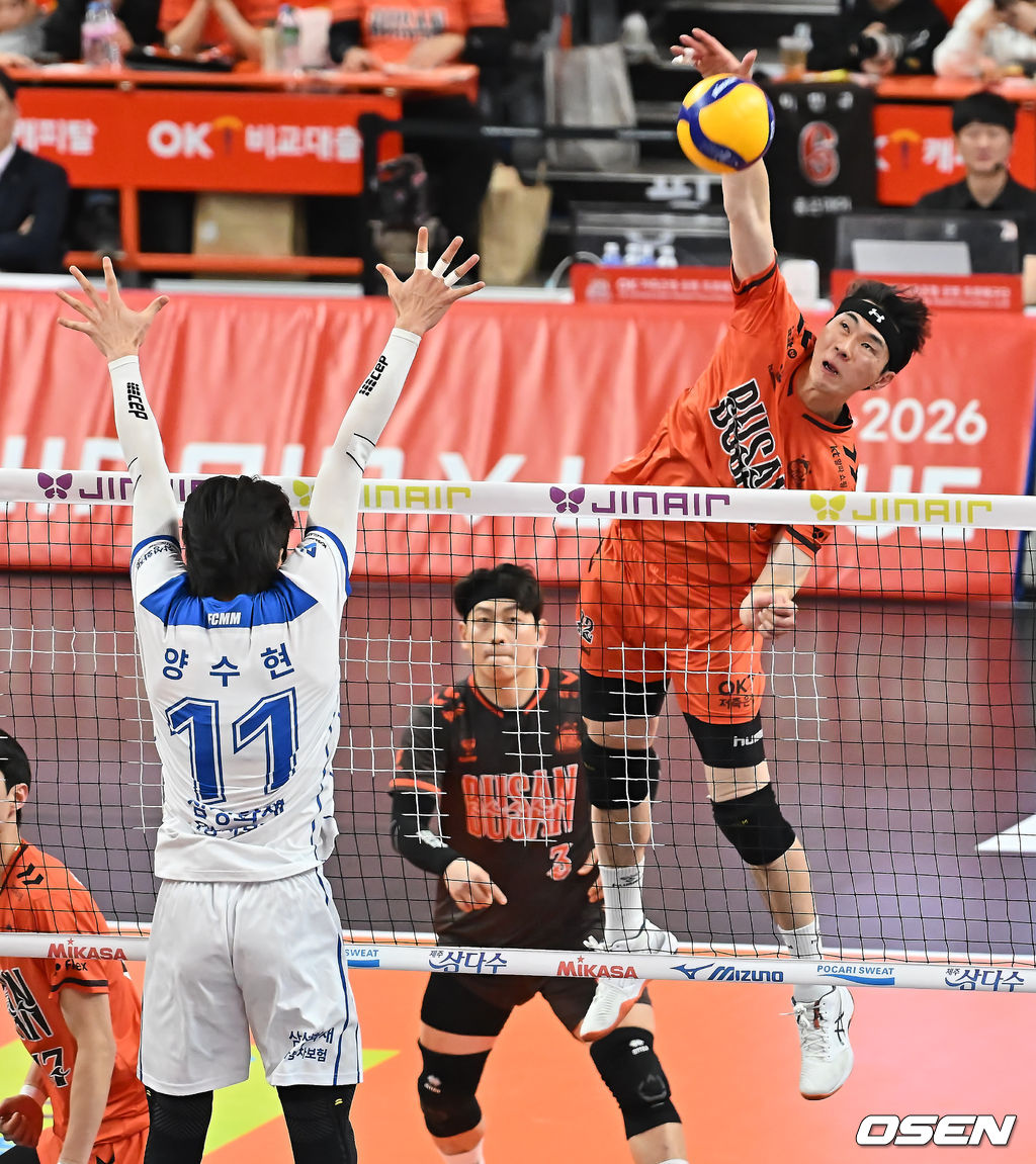 17일 부산 강서실내체육관에서 진에어 2025-2026 V리그 남자부 OK저축은행과 삼성화재의 경기가 열렸다.