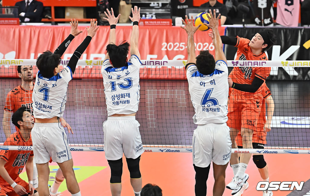 17일 부산 강서실내체육관에서 진에어 2025-2026 V리그 남자부 OK저축은행과 삼성화재의 경기가 열렸다.