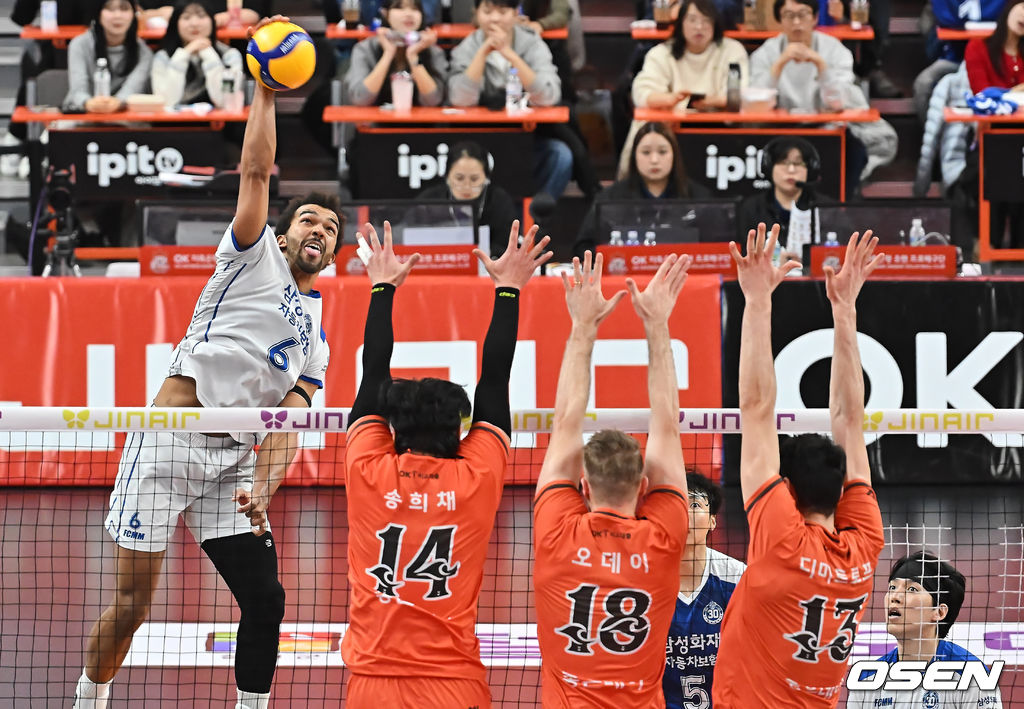 삼성화재 아히가 OK저축은행 블로킹을 뚫고 스파이크를 날리고 있다. 2026.01.17 / foto0307@osen.co.kr