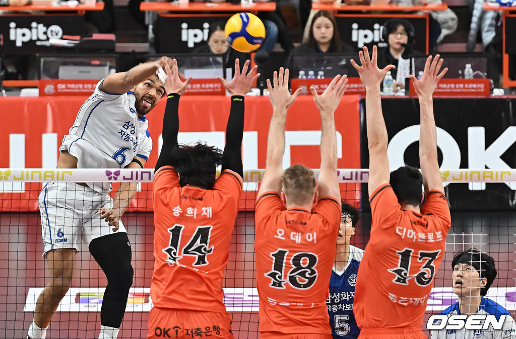 삼성화재 아히가 OK저축은행 블로킹을 뚫고 스파이크를 날리고 있다. 2026.01.17 / foto0307@osen.co.kr
