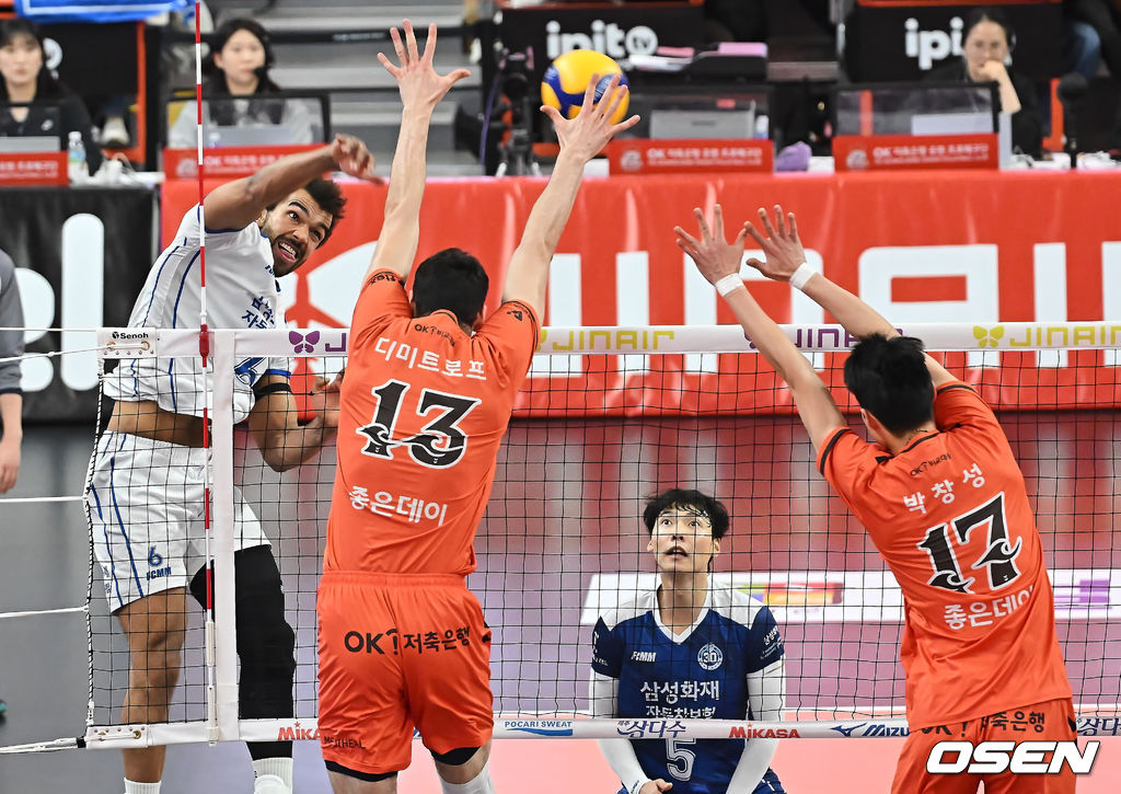 삼성화재 아히가 OK저축은행 디미트로프, 박창성의 블로킹을 뚫고 스파이크를 날리고 있다. 2026.01.17 / foto0307@osen.co.kr