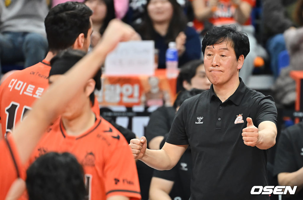 OK저축은행 신영철 감독이 득점을 올린 디미트로프를 보며 주먹을 불끈 쥐고 있다. 2026.01.17 / foto0307@osen.co.kr