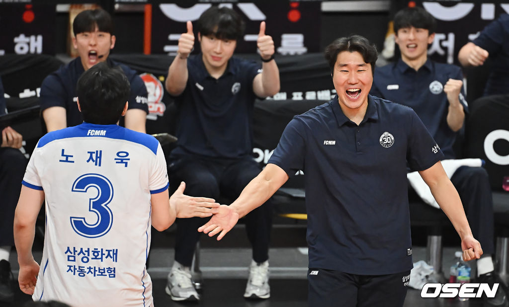 삼성화재 고준용 감독 대행이 블로킹 득점을 올린 노재욱과 하이파이브를 하고 있다. 2026.01.17 / foto0307@osen.co.kr