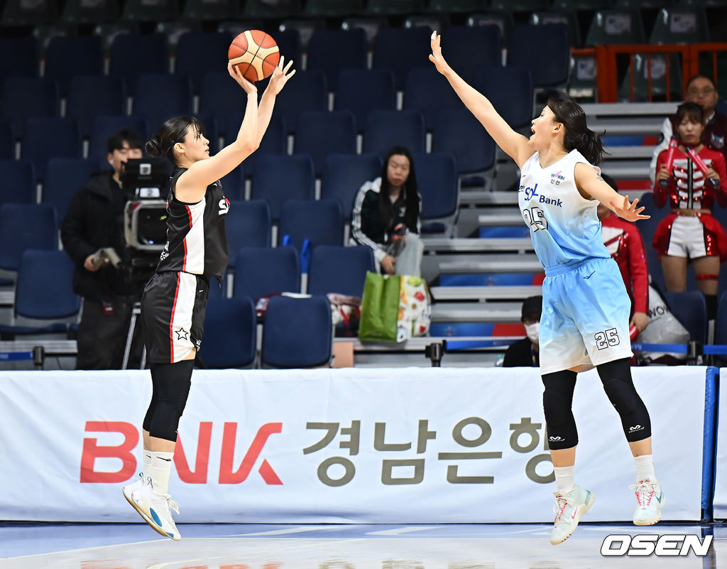 부산 BNK 변소정이 인천 신한은행 미마 루이의 마크를 피해 3점슛을 시도하고 있다. 2026.01.18 / foto0307@osen.co.kr