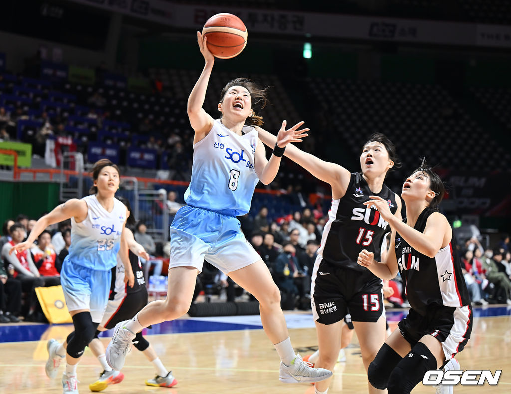 인천 신한은행 김지영이 부산 BNK 박성진, 변소정의 마크를 피해 골밑슛을 시도하고 있다. 2026.01.18 / foto0307@osen.co.kr