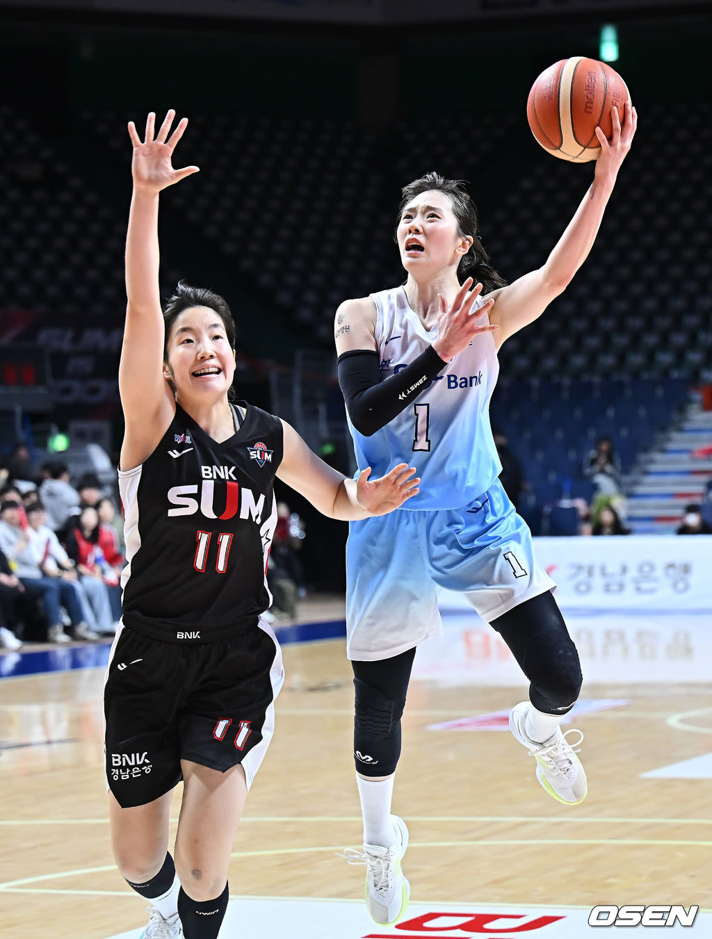 인천 신한은행 신이슬이 부산 BNK 김정은의 마크를 피해 골밑슛을 시도하고 있다. 2026.01.18 / foto0307@osen.co.kr