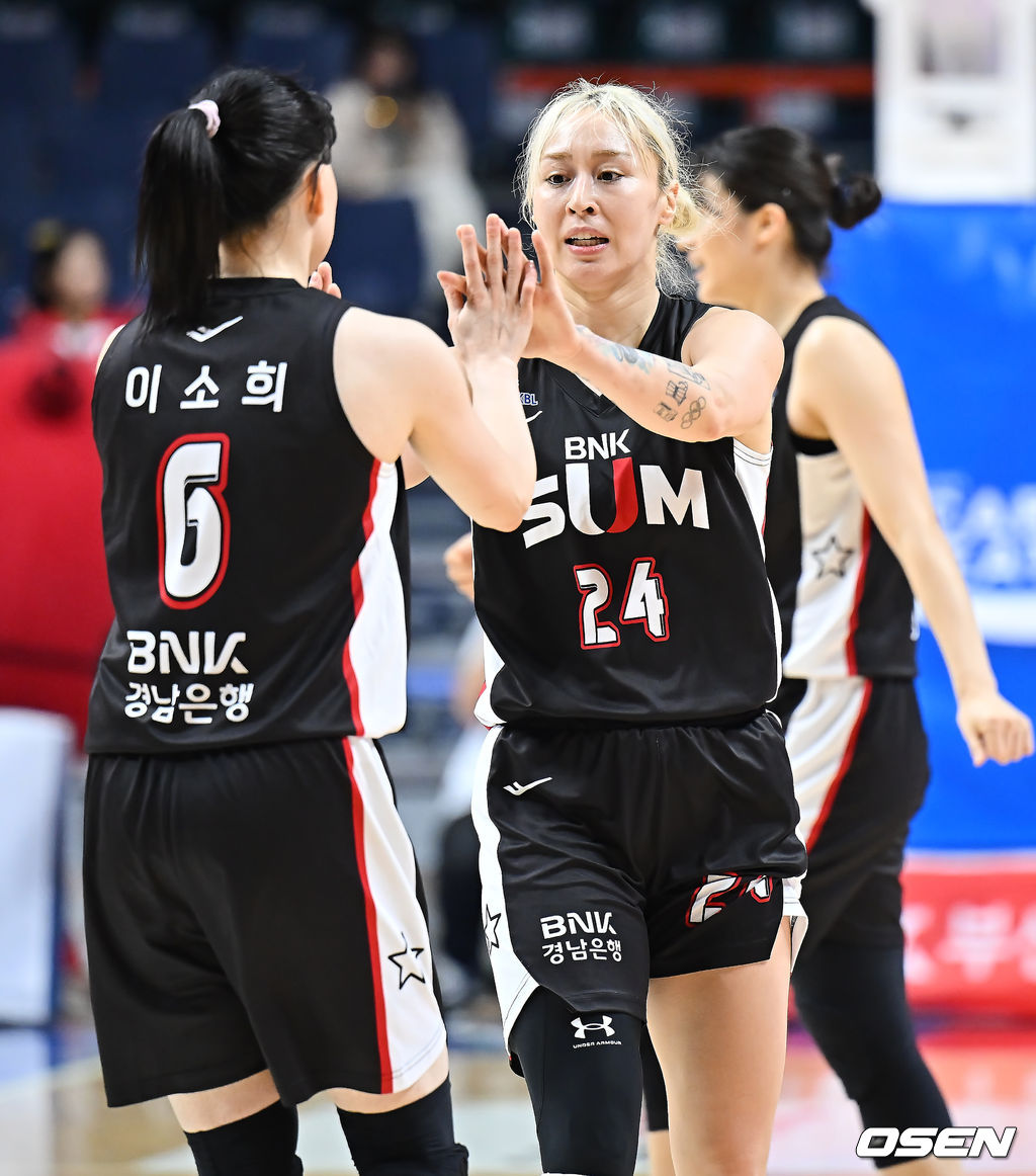 부산 BNK 김소니아가 4쿼터 막판 귀중한 역전 골을 성공시킨 이소희와 하이파이브를 하고 있다. 2026.01.18 / foto0307@osen.co.kr