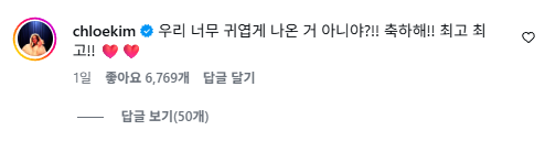 이런 우정이 그대로 이어졌다. SNS에 최가온이 클로이와 동메달리스트 오노 미츠키(일본)와 찍은 셀카와 함께 "꿈이 현실이 된 순간. 올림픽 금메달"이 올렸다. 클로이는 "우리(최가온, 클로이, 오노) 모두 너무 귀엽게 나온 거 아니야?!! 축하해!! 최고 최고!!"라고 순수하게 승자를 축하하는 우정을 선보였다.