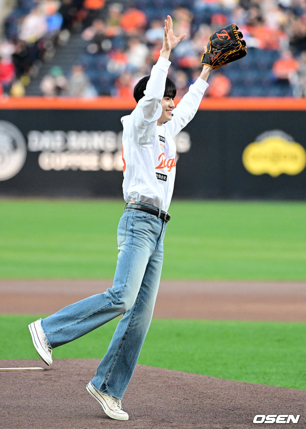 가수 하이라이트 양요섭이 시구를 마치며 세리머니를 하고 있다. 2026.04.14 / jpnews@osen.co.kr
