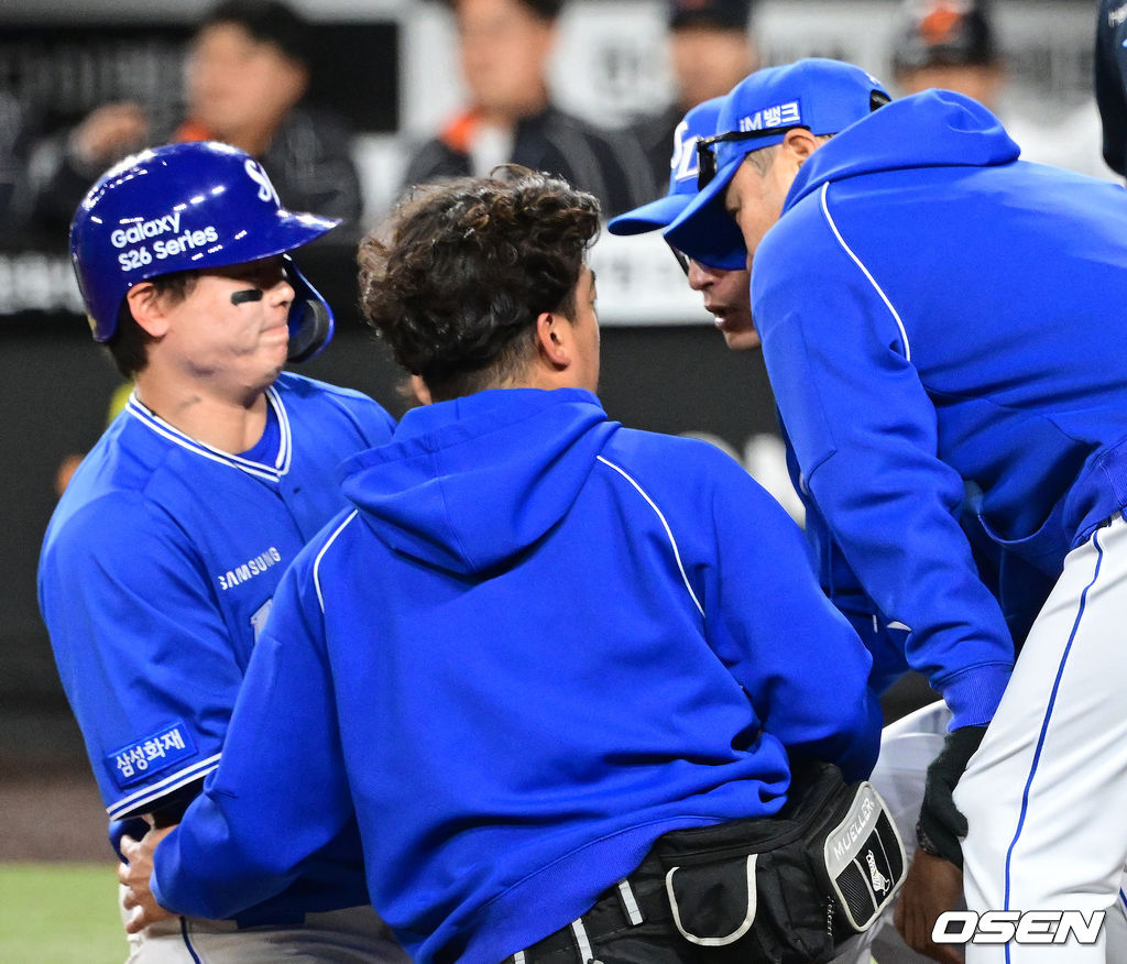 9회초 1사 1,2루에서 삼성 박진만 감독이 사구에 괴로워하는 박승규를 지켜보며 상태를 체크하고 있다. 2026.04.14 / jpnews@osen.co.kr