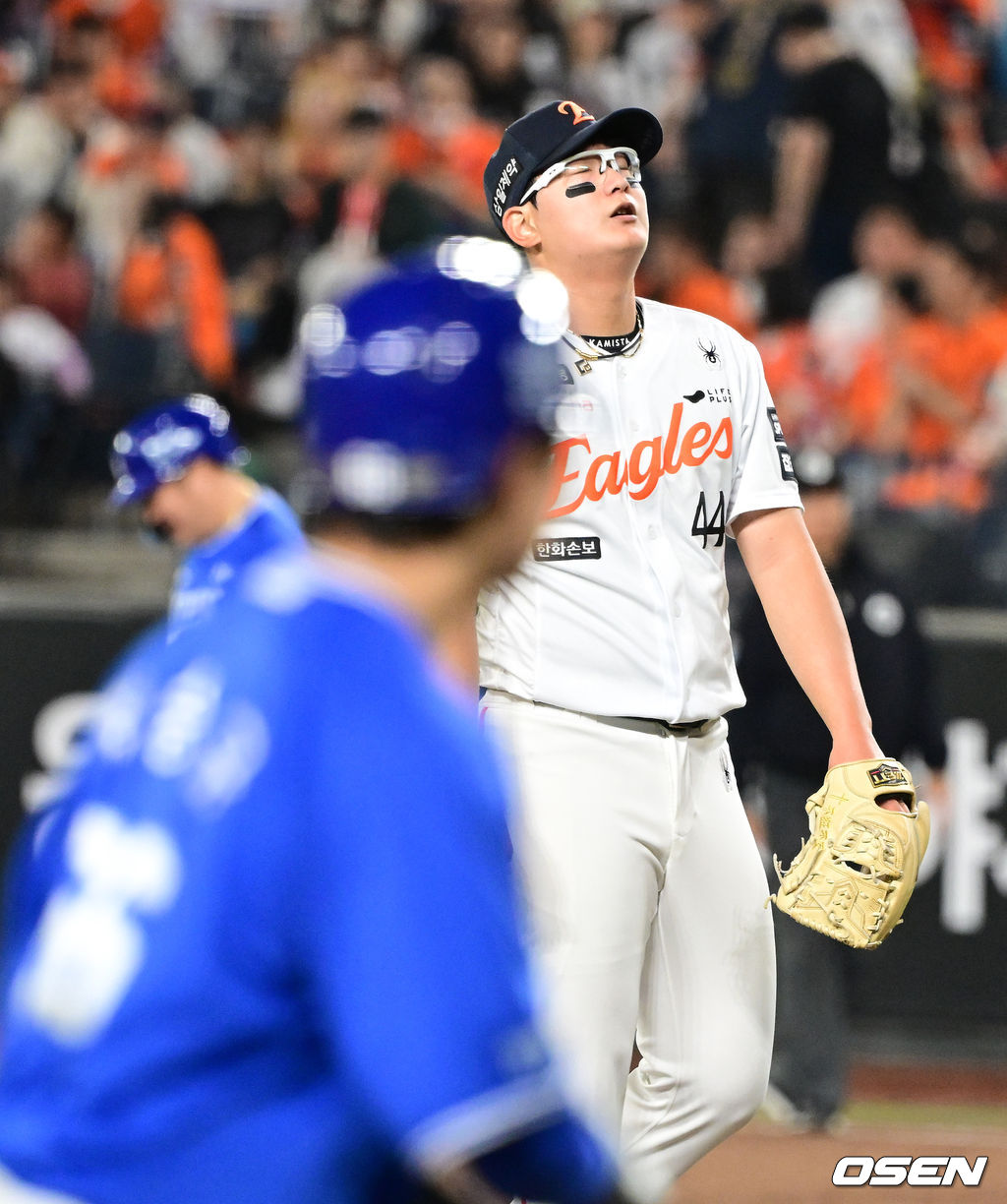 9회초 2사 만루에서 한화 김서현이 삼성 이해승에게 밀어내기 볼넷으로 역전을 허용하며 아쉬워하고 있다. 2026.04.14 / jpnews@osen.co.kr