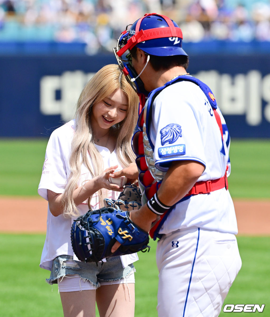경기에 앞서 키키 하음이 시구를 마치고 삼성 강민호와 인사를 나누고 있다. 2026.04.18 / jpnews@osen.co.kr