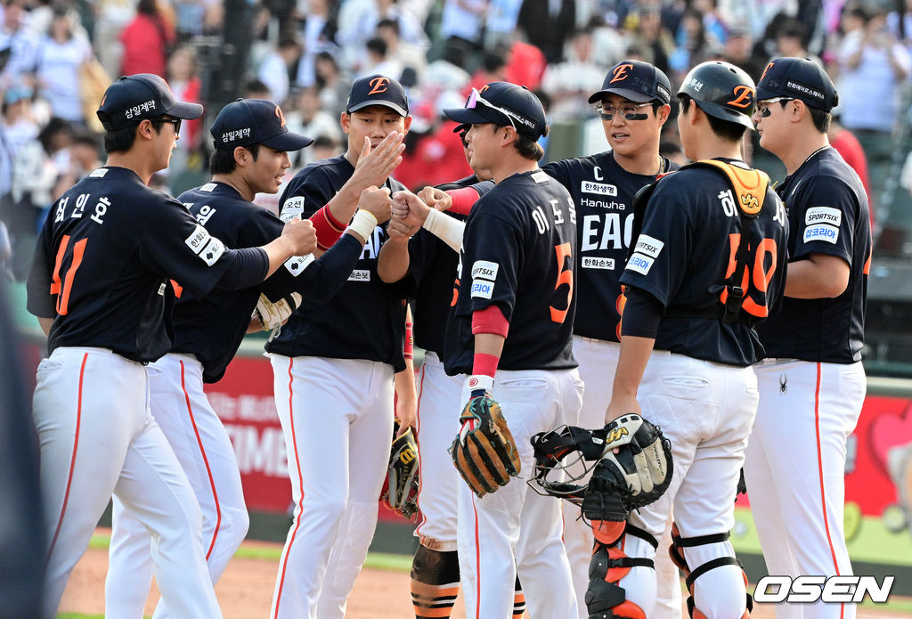 경기를 마치고 한화 선수들이 승리를 기뻐하고 있다. 2026.04.19 / jpnews@osen.co.kr