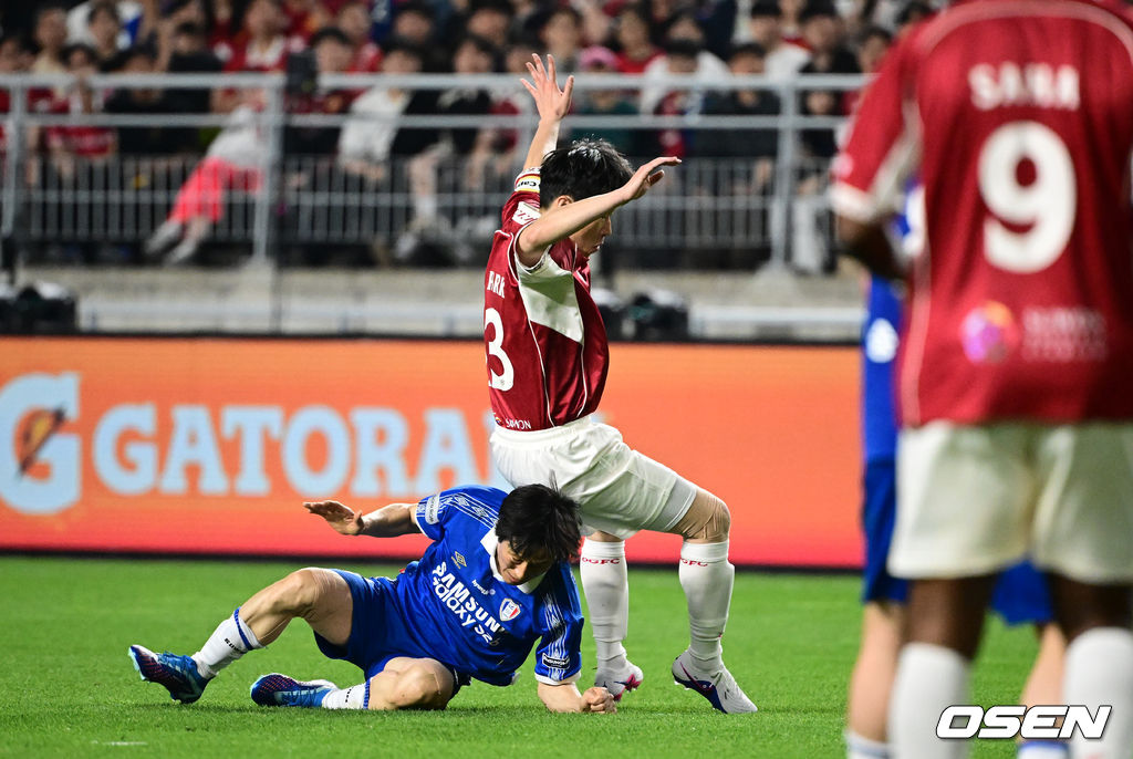 후반 OGFC 박지성이 슛동작 중 수원삼성 이병근과 충돌하고 있다. 2026.04.19 /cej@osen.co.kr