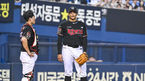 [OSEN=잠실, 박준형 기자] 6일 오후 서울 잠실구장에서 2023 신한은행 SOL KBO리그 LG 트윈스와 KT 위즈의 경기가 진행됐다.5회말 무사 1,2루 LG 박해민의 기습 희생번트때 KT 쿠에바스와 강현우 포수가 아쉬워하고 있다. 2023.07.06 / soul1014@