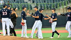 [OSEN=포항, 이석우 기자] 6일 포항야구장에서 2023 신한은행 SOL KBO리그 삼성 라이온즈와 두산 베어스의 경기가 열렸다. 두산 베어스 선수들이 삼성 라이온즈와의 3연전을 모두 이기고 하이파이브를 하고 있다. 2023.07.06 / foto0307@osen