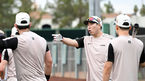 [OSEN=스코츠데일(미국 애리조나주), 이대선 기자] 2일(한국시간) 미국 애리조나주 스코츠데일에 위치한 인디언 스쿨 파크 베이스볼 필드에서 LG 트윈스의 스프링캠프가 진행됐다.LG 박동원이 코칭스태프의 도움을 받아 음료를 마