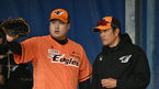 [OSEN=오키나와(일본), 조은정 기자] 26일 일본 오키나와 온나손 아카마 구장에서 삼성 라이온즈와 한화 이글스의 연습경기가 열린다.경기 전 한화 류현진이 불펜피칭 중 박승민 코치와 대화를 하고 있다. 2024.02.26 /cej@osen.co.kr