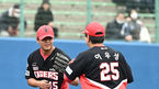 [OSEN=오키나와(일본), 조은정 기자] 27일 일본 오키나와 우라소에 ANA 볼파크에서 KIA 타이거즈와 일본프로야구 야쿠르트 스왈로스와 연습경기가 열렸다.8회말 수비 이닝을 마친 김민주가 좋은 수비를 선보인 이우성에게 고마움