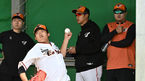 [OSEN=오키나와(일본), 조은정 기자] 28일 일본 오키나와현 고친다 구장에서 한화 이글스와 KT 위즈의 스프링캠프 연습경기가 열릴 예정이다.경기 전 훈련에서 한화 문동주가 박승민 코치와 대화를 나누고 있다. 2024.02.28 /cej@osen.co.